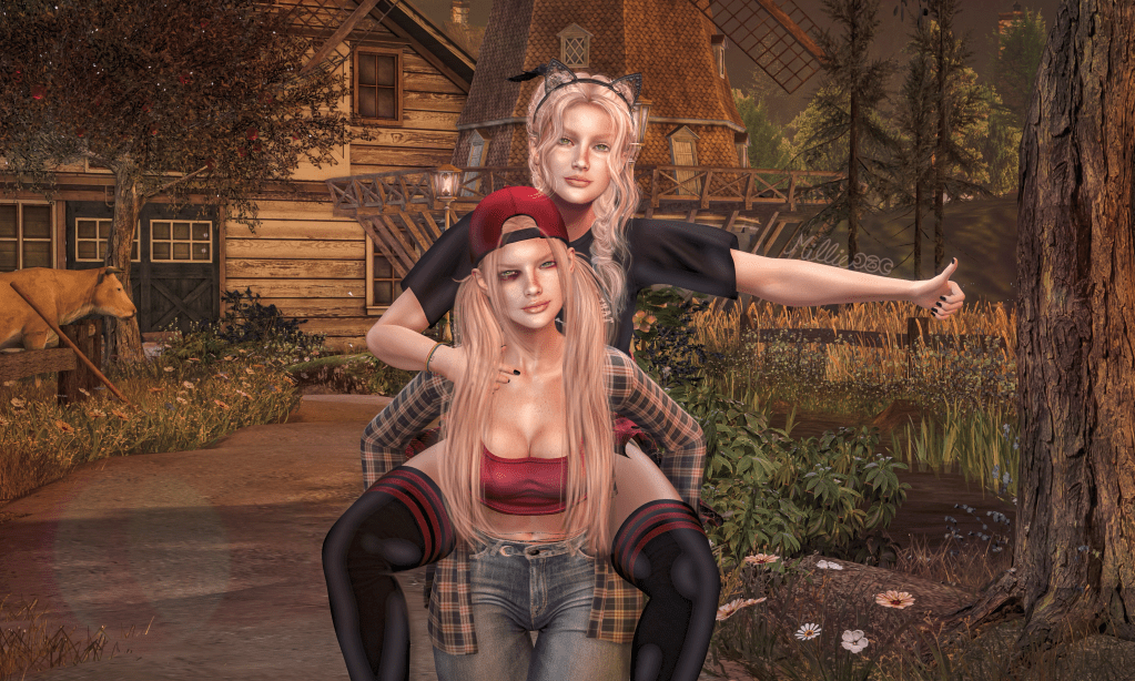 So to home we go and we do what we do best when we have time and are too high to do anything else – take a pic and document our side quest! We used a barn we already had (face palm) and took this picture of us “gettin’ tf outta this dang town” as our teenaged selves would have most definitely done. I am so grateful to have found my twin sister, Millie (which sounds really strange, but this is Second Life, so that’s the least of our worries, right?) As always all photo credit goes to Millie Moonchild (except the double barns, that’s all me.)